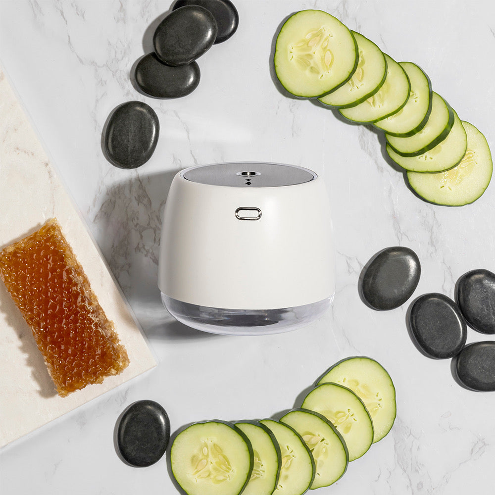 Our luxury fine-mist diffuser uses motion sensing technology to dispense quality, hydrating sanitizer with the simple wave of a hand. Our luxury fragrance 'Day at the Spa' has notes of cucumber, honey, & sweet aromatherapies for maximum relaxation.